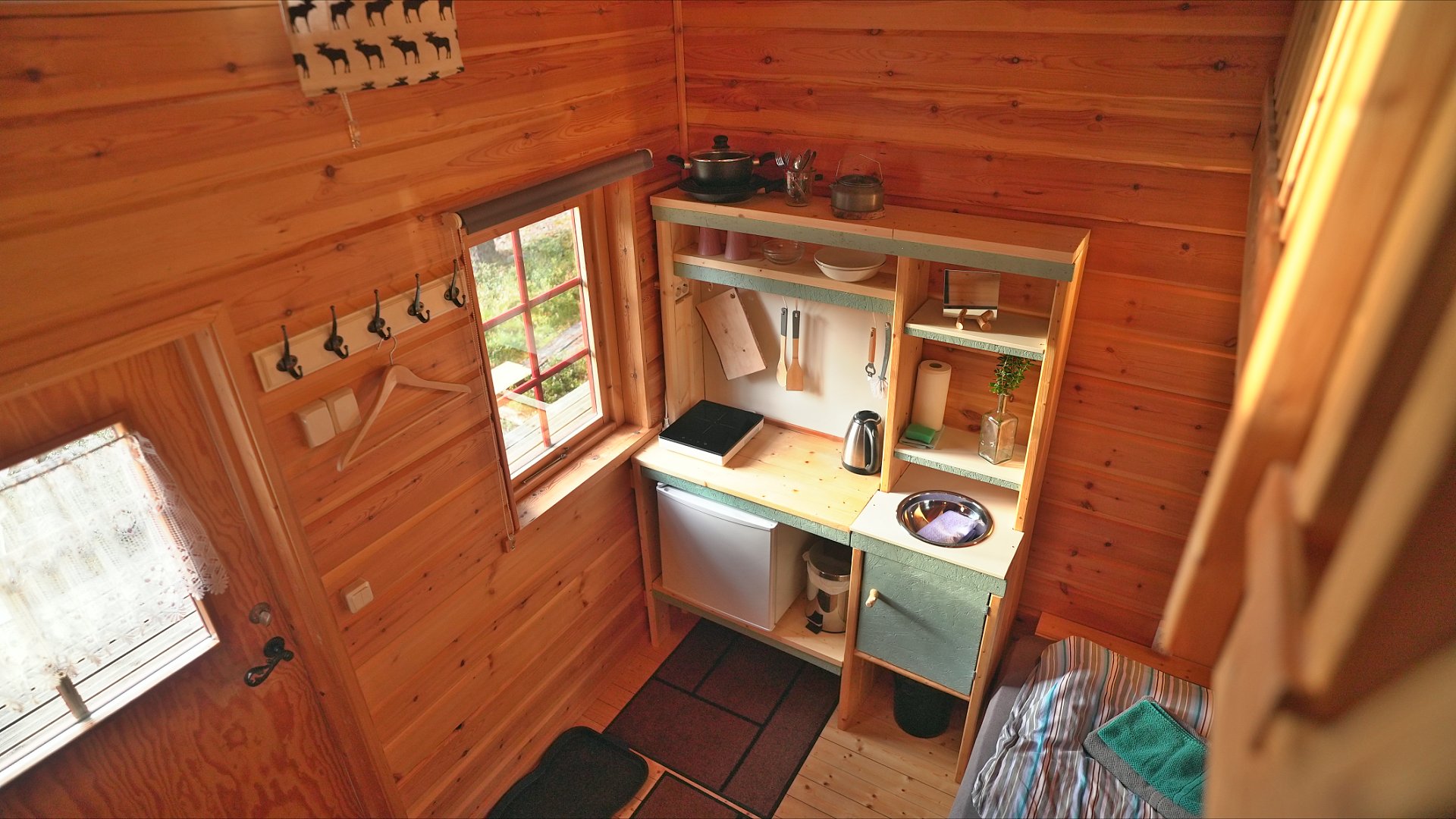 ein kleiner Kühlschrank, eine zweier Herdplatte, Geschirr, Tassen, Trinkgläser, Besteck, Topf, Pfanne, Schneidebrett, Unterstetzer, Kochlöffel-/wender… - an die Stuga ist eine Trockentoilette für „Notfälle“ angebaut
